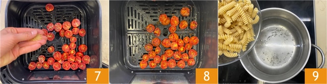 Colocar los tomates cherry en la cesta de la freidora de aire con la parte cortada hacia arriba, añadir el azúcar moreno restante 7 y cocer a 160° durante 10 minutos, luego subir la temperatura a 180° y continuar la cocción durante otros 10 minutos, o hasta que estén secos y caramelizados 8. Mientras tanto, cocer la pasta en abundante agua hirviendo con sal 9.