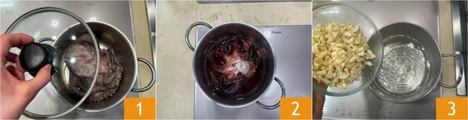 Para preparar la pasta fría con pulpo, lo primero que hay que hacer es colocar el pulpo en una olla para la cocción "en seco": el pulpo se cocinará en su propia agua. Cubre con una tapa 1 y deja cocinar a fuego medio-bajo durante 20-30 minutos 2, luego déjalo enfriar en la olla. Mientras tanto, cocina la pasta 3 y, cuando esté lista, escúrrela, transfiérela a un bol, aliña con un chorrito de aceite y deja enfriar.