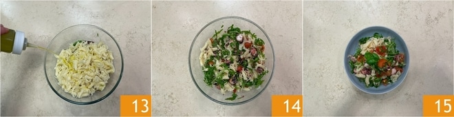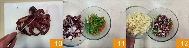 Tan pronto como el pulpo esté frío, córtalo en trozos 10, si prefieres puedes quitar un poco de piel frotándolo con papel de cocina. Añade el pulpo al bol con la rúcula y los tomates 11, luego añade también la pasta ya fría 12.