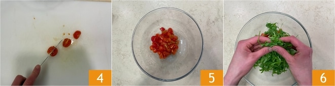 Lava los tomatitos y córtalos en 4, o por la mitad si son pequeños 4. Transfiérelos a un bol grande 5 y añade también la rúcula, desmenuzándola con las manos 6.
