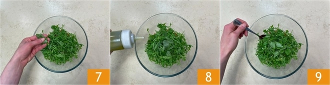 Añade algunas hojas de albahaca 7 y aliña con aceite de oliva virgen extra 8. Mezcla bien y deja saborizar 9.