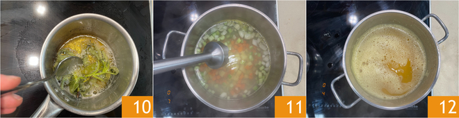 Retirad la salvia y reservad la mantequilla avellanada 10. Mientras tanto, las verduras estarán bien cocidas, así que triturad todo directamente en la olla con una batidora de mano 11 hasta obtener un caldo liso y homogéneo 12. Añadid una pizca de sal y mantened en caliente.