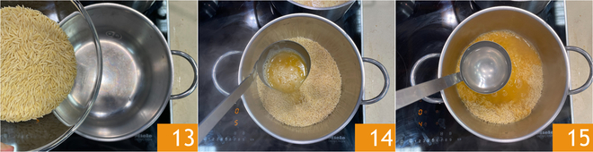 En otra olla, verted los risoni 13 y bañad con el caldo de verduras triturado caliente 14 y un cazo de agua 15. Llevad a ebullición y cocinad durante unos 10 minutos (o el tiempo indicado en el envase).