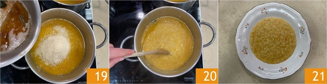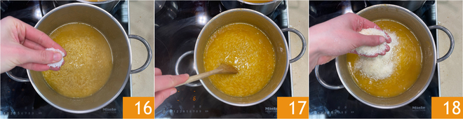 A mitad de la cocción de la pastina, añadid sal 16. Mezclad a menudo y continuad la cocción hasta que los risoni estén blandos y envueltos en una consistencia cremosa 17. Al final de la cocción, apagáis el fuego y añadís el queso rallado para mantecar 18.