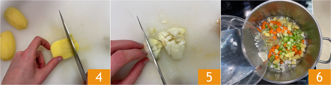 Cortadla en dados del mismo tamaño que las otras verduras 4. Finalmente, limpiad la cebolla y cortadla también en trozos de aproximadamente 1 cm 5. Trasladad todas las verduras a una olla grande y cubrid con el agua prevista en la receta 6.