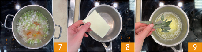 Llevad a ebullición 7 y dejad hervir a fuego lento hasta que las verduras estén muy blandas; tomará unos 15 minutos. Mientras las verduras se cocinan, dedicad tiempo a la mantequilla avellanada: poned la mantequilla en un cazo 8 y dejad que se derrita a fuego medio-bajo, luego añadid la salvia 9 y continuad cocinando hasta que la mantequilla comience a hacer espuma y a tomar un color ligeramente ámbar, liberando un aroma intenso; tomará unos 5 minutos.