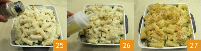 Finalmente, añadan una pizca más de pimienta 25 y un chorrito de aceite de oliva 26. Cuezan la pasta en el horno estático precalentado a 180° durante unos 30 minutos o hasta que la superficie esté bien dorada 27. ¡Su pasta gratinada con espinacas está lista para ser servida!