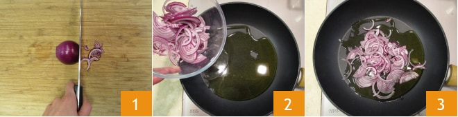 Para preparar la pasta nduja y pecorino empezad por las cebollas: limpiadlas y cortadlas finamente 1. Id a la cocina y poned a hervir el agua para la pasta. Mientras tanto, verted en una sartén antiadherente 2 y dejad estofar a fuego bajo durante unos 15 minutos 3; si el fondo se seca demasiado rápido, añadid un poco de agua.