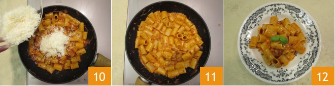 Apagad el fuego y añadid el pecorino rallado 10, si es necesario, verted un poco de agua y mezclad rápidamente 11. Servid vuestra pasta 'nduja y pecorino con un poco de albahaca y un hilo de aceite en crudo: ¡buen provecho 12!