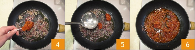 Cuando la cebolla esté blanda, añadid la 'nduja 4 y dejadla derretir con un cucharón de agua caliente 5 y dejad que adquiera sabor por unos instantes 6.