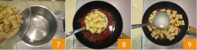 Mientras tanto, hervid la pasta en agua salada al gusto 7 y cuando falten un par de minutos para el final de la cocción, escurridla directamente en el condimento 8. Subid el fuego y añadid un poco más de agua 9.