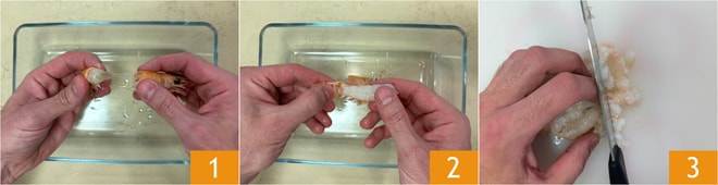 Para preparar la pasta patatas y gambones, lo primero es preparar el caldo de verduras siguiendo nuestra receta y mantenerlo caliente. Procedan a la limpieza de los gambones: separen la cabeza 1, eliminen el caparazón 2 y el intestino, luego corten finamente la carne 3. Trasládenlos a un bol y déjenlos reposar en el frigorífico hasta el momento de su uso.