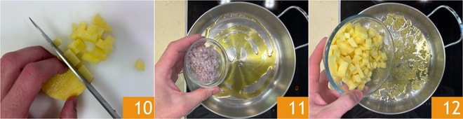 Pelen las patatas y córtenlas primero en rodajas, luego en bastones y finalmente en pequeños cubos 10. En una olla calienten un chorro de aceite, añadan el chalote 11 y sofrían durante unos minutos. Agreguen las patatas 12.
