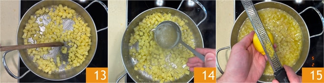 Cocinen a fuego alto durante unos 5 minutos, revolviendo continuamente para evitar que se peguen 13. Cuando las patatas estén doradas uniformemente, cubran con el caldo de verduras caliente 14 y continúen la cocción durante otros 6 minutos. Una vez cocidas, apaguen el fuego y aromatizen con la ralladura de limón 15.