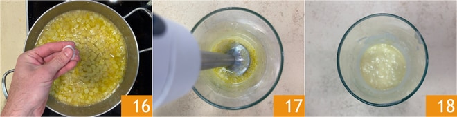 Ajusten de sal 16 y trasladen todo a un vaso. Añadan el jugo de limón y el aceite, luego trituren con una batidora de inmersión 17, hasta obtener una crema homogénea y aterciopelada 18. Reserven.