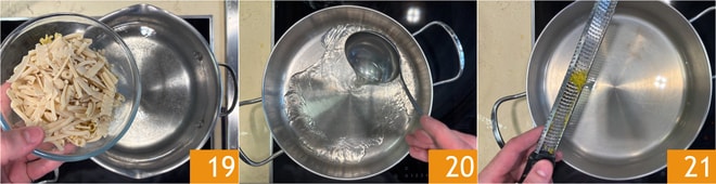En este punto cuezan la pasta en abundante agua salada 19; calculen 3-4 minutos menos que el tiempo indicado en el paquete. Mientras tanto, preparen la base que recibirá la pasta: en una cacerola viertan algunos cucharones de caldo de verduras 20, luego aromatizen con la ralladura de limón 21.