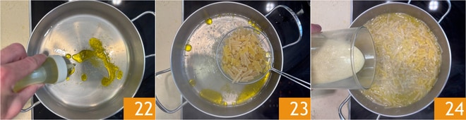 Agreguen el aceite 22 y lleven a ebullición. Escurran la pasta y trasládenla a la cacerola 23, luego unan la crema de patatas 24.