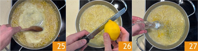 Mezclen y terminen la cocción de la pasta 25. Al final de la cocción, a fuego bajo, agreguen la ralladura de limón 26 y una pizca de pimienta blanca 27.