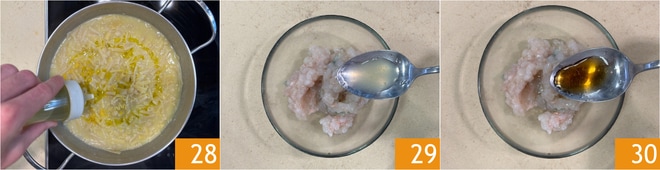 Finalmente, añadan un chorro de aceite 28. Apaguen el fuego y dejen reposar la pasta. Mientras tanto, sazonen el tartar de gambones con jugo de limón 29 y colatura de anchoas 30.