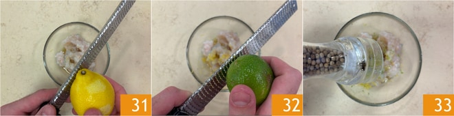 Perfumen con la ralladura de limón 31 y de lima 32. Añadan una pizca de sal y pimienta blanca 33. Mezclen suavemente para amalgamar bien los ingredientes.