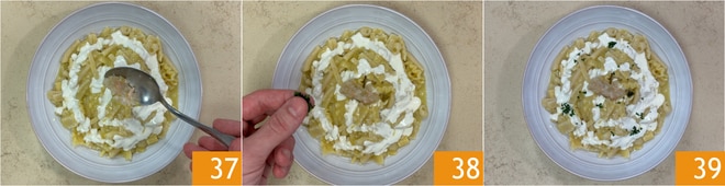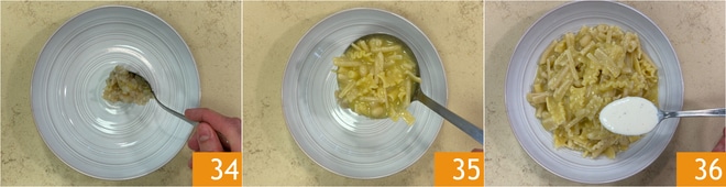 Todo está listo para el emplatado: pongan una generosa cucharada de tartar de gambones en el centro del plato 34, luego añadan la pasta y patatas 35 y la colatura de queso y pimienta 36.
