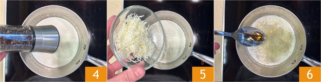 Ahora dedíquense a la colatura de queso, pimienta y anchoas: viertan la nata en un cazo, luego añadan la pimienta negra 4, el queso caciocavallo rallado 5 y la colatura de anchoas 6.