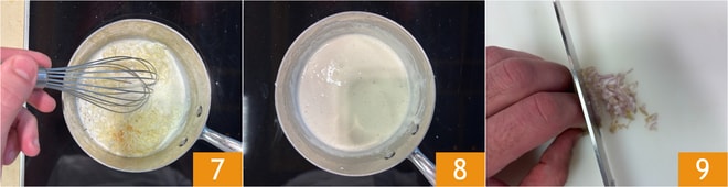 Calienten a fuego lento, revolviendo con un batidor 7 hasta obtener una mezcla suave y aterciopelada 8. Reserven y ocúpense de la crema de patatas: mondar y picar el chalote 9.