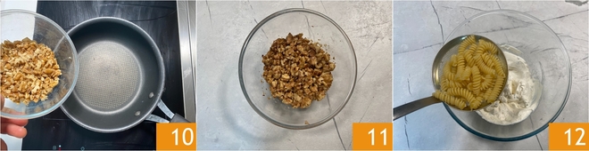 Después transfiérelas a una sartén antiadherente bien caliente 10 y tuéstalas durante 4-5 minutos, removiendo a menudo, hasta que estén doradas y desprendan todo su aroma. Apaga el fuego, transfiérelas al bol 11 y déjalas enfriar un poco. Mientras tanto, la pasta estará al dente. Escurre los fusilli (sin tirar el agua) y transfiérelos directamente al bol con la ricotta condimentada 12.