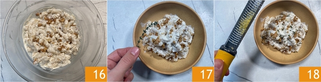 Mezcla de nuevo 16 y sirve enseguida completando con más tomillo fresco 17, un poco más de nueces y una ralladura de limón 18 para un toque final fresco y aromático.