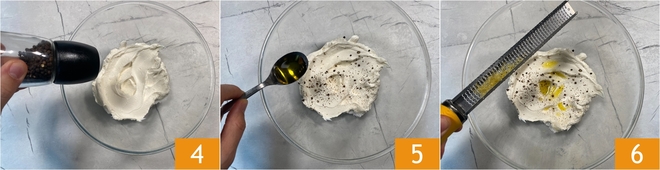 Añade también una pizca de pimienta 4, un chorrito de aceite de oliva virgen extra 5 y la mayor parte de la ralladura de limón 6.