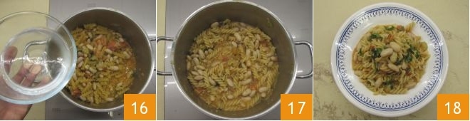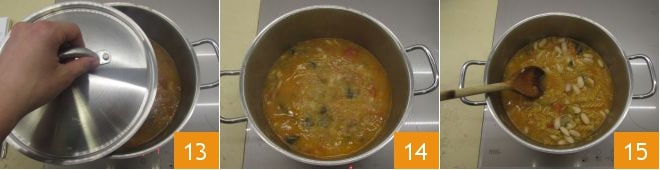 cubre con la tapa 13 y cocina a fuego medio pero no demasiado alto durante 20 minutos, removiendo de vez en cuando. Pasado este tiempo, quita la tapa 14 y cocina otros 15-20 minutos o hasta que las judías estén tiernas. En este punto, añade la pasta y remueve 15.