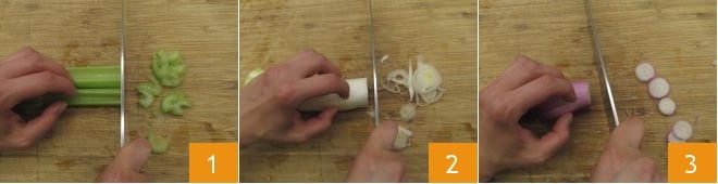 Para preparar la pasta y judías de verano, lo primero que hay que hacer es lavar y cortar el apio y cortarlo en rodajas 1, luego pelar el puerro, cortarlo y cortarlo en rodajas finas 2. Limpia la cebolleta y córtala de la misma manera 3.