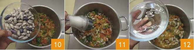 y las judías 10. Sala 11, vierte agua hasta cubrir las verduras 12,