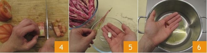 Lava los tomates, córtalos en rodajas y luego en cubos 4. Por último, desgrana las judías frescas 5. Una vez listas las verduras, puedes pasar a la cocción: calienta el aceite en una cazuela grande, sazona con la guindilla unos instantes 6
