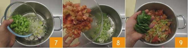 y luego añade el apio, la cebolleta y el puerro 7. Sofríe durante un par de minutos, luego añade los tomates en cubos 8, las hojas de albahaca 9