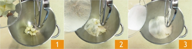 Para preparar la tarta bicolor, lo primero es ocuparse de la masa quebrada. Corta la mantequilla fría en cubos y colócala en el bol de una batidora, equipada con el accesorio de pala 1. Añade la harina 2 y el azúcar 3.