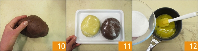 Transfiérela nuevamente a la superficie y compáctala, sin calentarla excesivamente con las manos 10. Forma luego dos bloques, uno de cacao y otro blanco, envuélvelos en film 11 y deja reposar en el frigorífico durante al menos 30 minutos. Mientras tanto, prepara la crema pastelera. En una cacerola, combina el azúcar y las yemas 12.