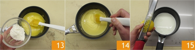 Mezcla con una espátula para no incorporar aire, luego añade la harina 13. Mezcla siempre con la espátula 14. En otra cacerola, vierte la leche y la cáscara rallada de limón 15. Lleva a ebullición.