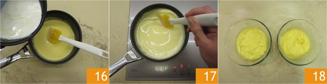 Tan pronto como la leche comience a hervir, vierte una pequeña cantidad sobre la mezcla de huevos 16, mezclando con una espátula. Luego vierte toda la leche, mezcla con espátula o batidor y vuelve al fuego. Cocina 17 hasta que la crema se haya espesado y esté casi a punto de hervir. Divide la crema en dos partes iguales, transfiriéndola a dos boles separados 18.