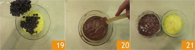 Añade el chocolate picado en uno de los dos boles 19, mezcla bien con una espátula o un batidor hasta que se haya derretido y obtengas una mezcla homogénea 20. Cubre ambas cremas con film 21 y deja enfriar en el frigorífico durante aproximadamente 1 hora.