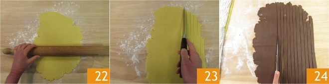 Cuando la crema esté fría y la masa quebrada haya reposado, podrás montar tu tarta. Extiende primero la masa quebrada blanca hasta obtener un rectángulo de aproximadamente 3-4 mm de espesor 22. De este, corta tiras de aproximadamente 1 cm de ancho 23. Repite la misma operación para la masa de cacao 24.