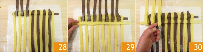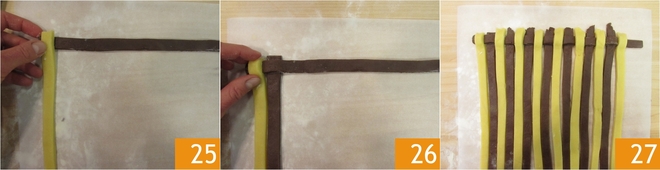 Ahora coloca una hoja de papel de horno sobre una superficie. Coloca horizontalmente una tira de cacao. Coloca el inicio de una blanca sobre la de cacao, colocada perpendicularmente 25, y al lado una de cacao 26. Continúa de esta manera alternando los colores, para esta fase necesitarás 8 tiras blancas y 8 de cacao 27.