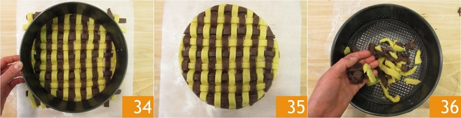 Utilizando el aro de un molde desmontable de 22 cm, corta el trenzado 34 y reserva en el frigorífico para que se endurezca mejor 35, lo necesitarás posteriormente. Recoge todos los restos de masa quebrada para realizar la base veteada de la tarta 36.