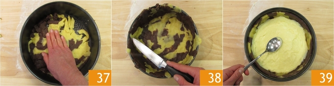 Presiona bien con las manos directamente en la base, para extender la masa tanto en la base 37 como en el borde. Levántalo lo más posible ya que tendrá que contener las dos cremas. Con un cuchillo pequeño elimina el exceso de masa 38. Vierte primero la crema pastelera clásica en el interior, nivela con el dorso de una cuchara 39 y transfiere al frigorífico durante 10 minutos.
