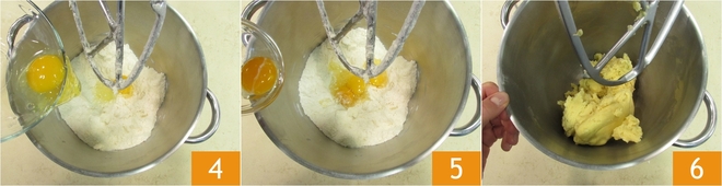 Pon en marcha la batidora y trabaja durante unos 2 min. Añade los huevos enteros 4 y las yemas 5. Vuelve a poner en marcha la máquina y trabaja hasta obtener una masa homogénea y compacta 6.
