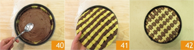 Transfiere la crema pastelera de chocolate sobre la clásica y nivela con el dorso de una cuchara 40. Coloca sobre la crema la tapa de masa quebrada bicolor que habías guardado en el frigorífico, levantándola y colocándola muy delicadamente 41 y presiona levemente los bordes para que se adhieran a la corteza de masa quebrada. Cocina en horno estático precalentado a 170° durante 45 minutos. Luego, sube el horno a 180° y continúa cocinando durante otros 15 minutos. Saca del horno 42 y deja enfriar completamente antes de servir tu tarta bicolor.