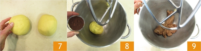 Transfiere la masa a una superficie, trabaja brevemente el tiempo necesario para compactarla y dividirla en dos partes iguales 7. Vuelve a colocar una de las mitades en la batidora y añade el cacao amargo 8. Trabaja con el accesorio de pala poco tiempo, hasta obtener una masa de color uniforme 9.