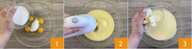 Para preparar el pastel cuatro cuartos de cacao, lo primero es pesar los huevos sin cáscara y verterlos en un bol. Añadir el azúcar 1 y batir con las varillas eléctricas 2 hasta que la mezcla aumente de volumen, volviéndose clara y espumosa. En este punto, añadir la mantequilla blanda en trozos 3 y trabajar con las varillas para integrarla. Añadir también el extracto de vainilla y mezclar nuevamente.