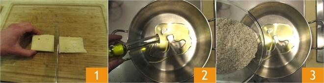 Para realizar la tarta de arroz en sartén, primero corta la fontina en rodajas finas (quítale la corteza) 1. En una cazuela amplia de bordes altos, vierte un chorrito de aceite 2, el arroz 3,