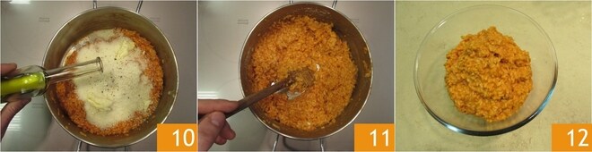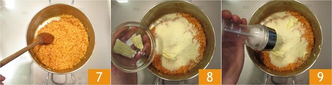 Al terminar la cocción, el arroz debe quedar seco 7, déjalo reposar durante dos minutos. Una vez finalizado el reposo, comienza la manteca: vierte parmesano, la mantequilla 8, ajusta de sal 9 y pimienta